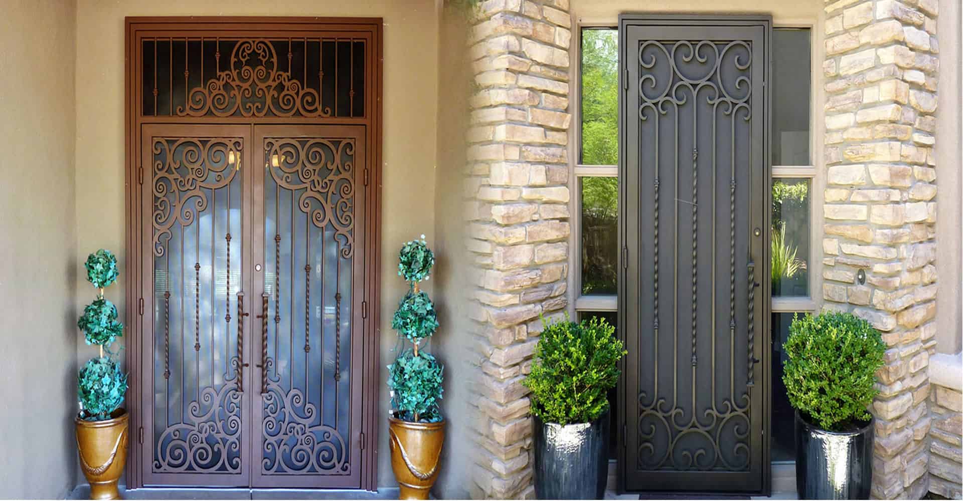 Images tagged "artistic-entry" Model 667 - iron entry door featuring a curved geometric design with custom copper inlay