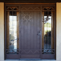 Images tagged "decorative-ironwork" Model 814 - Custom rustic entry door with elegant scroll design, modern finish, and custom surround Custom iron entry door with arched transom, matching sidelights, floral scrollwork, and rain glass panels